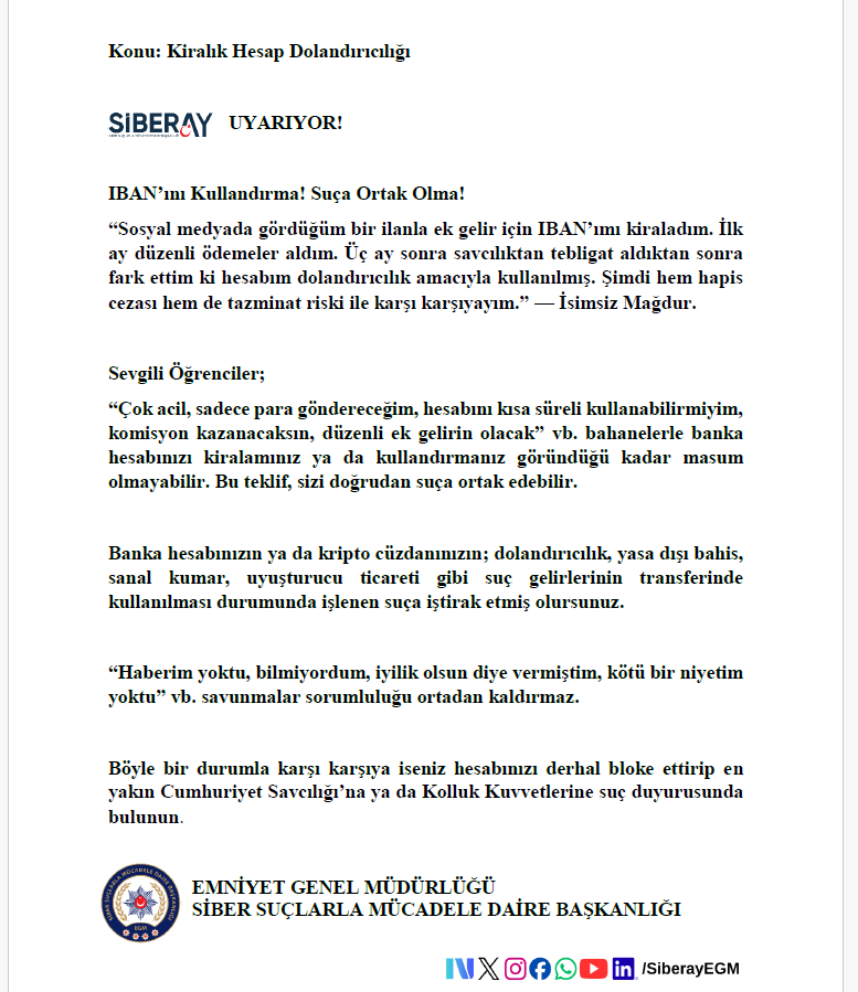 Kiralık Hesap Dolandırıcılığı Hakkında Bilgilendirme